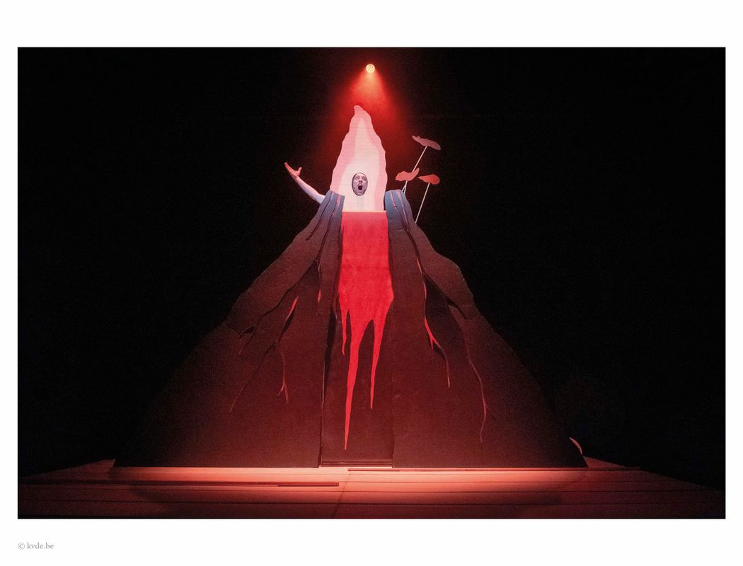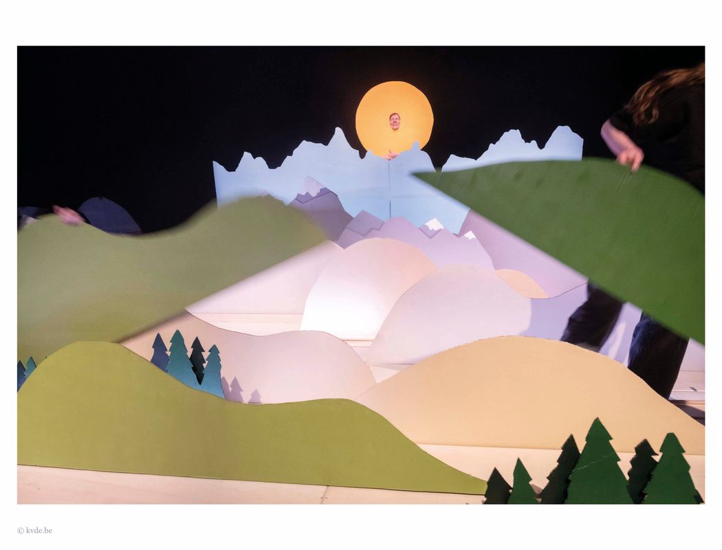 ‘Er rent een berg voorbij’ vertelt het verhaal van de 4,54 miljard jaar durende geschiedenis van de aarde. Het monumentale, muzikale epos over hoe onze wereld voortdurend in beweging is, speelt zich af in een enorm decor van kartonnen rivieren, wolken en bomen. Er kruipen hele wouden over het podium, bergen verkruimelen tot zand en de maan danst een walsje met de zee. Een vierstemmig koor zorgt voor de soundscape, van krakende rotsen tot tsjilpende vogels.
